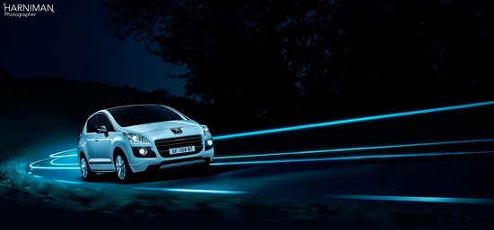 Night shots of the Peugeot diesel hybrid car on the road outside Paris.