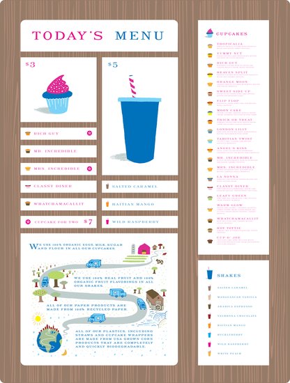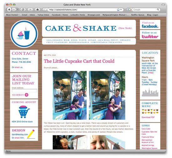 Cake & Shake is a gourmet, organic cupcake and milkshake cart with locations in Washington Square Park and the Metropolitan Museum of Art. All creative direction, branding, web design, icon design, illustration by me.